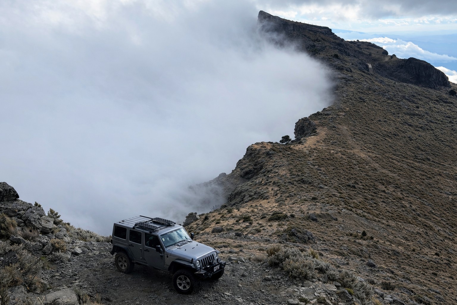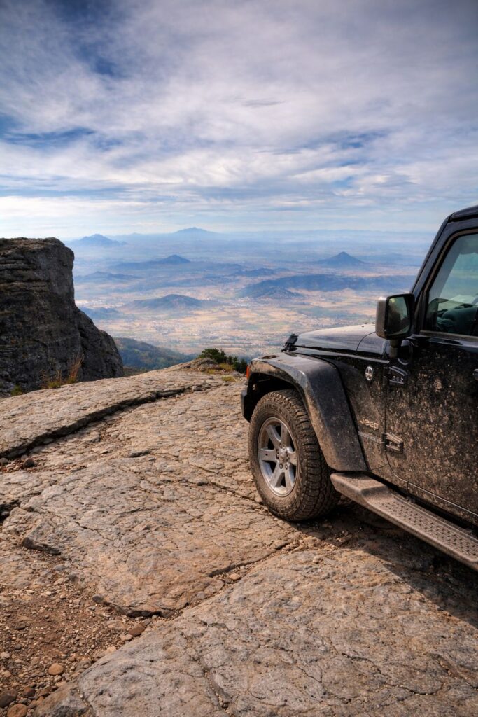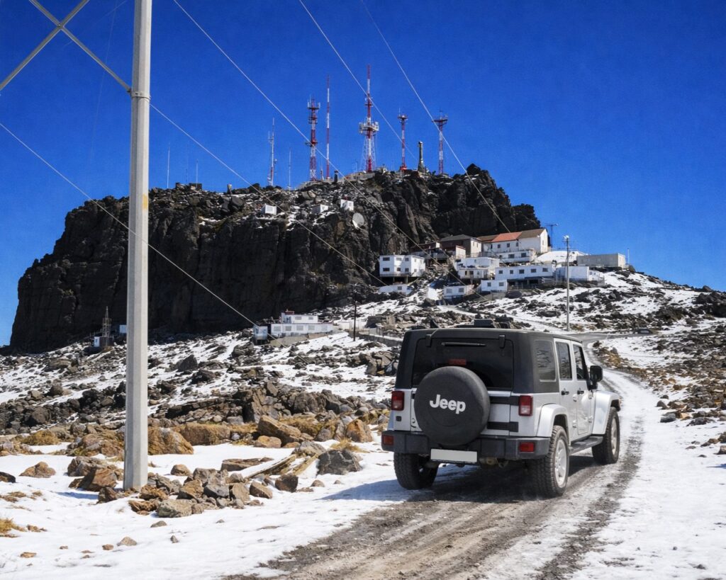 Más arriba, la montaña cambia de carácter. La pendiente exige respeto, el terreno pone a prueba la tracción y la pericia. Aquí es donde nuestros 4×4 cuentan la historia, avanzando con calma y determinación hacia la cima, donde el viento sopla fuerte y el paisaje se abre en todas direcciones. Desde lo alto, el Cofre revela su tesoro: una vista que corta la respiración y la certeza de haber conquistado un gigante.